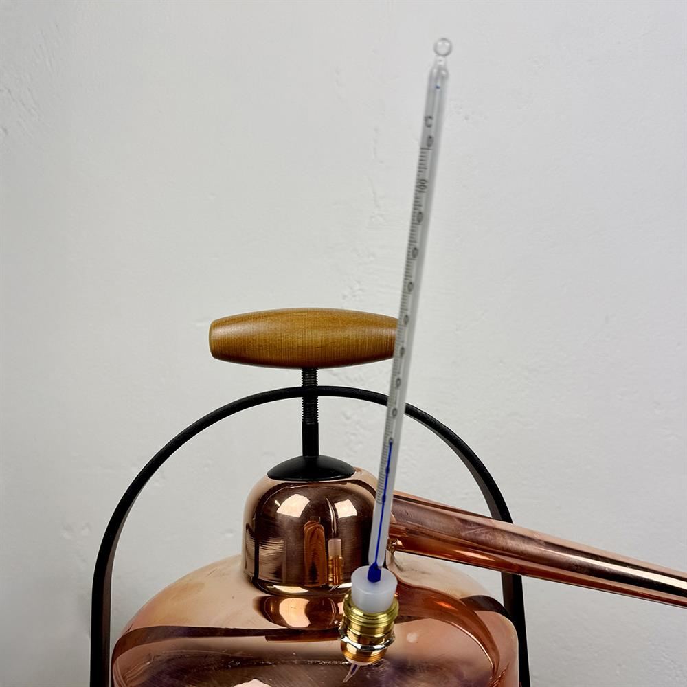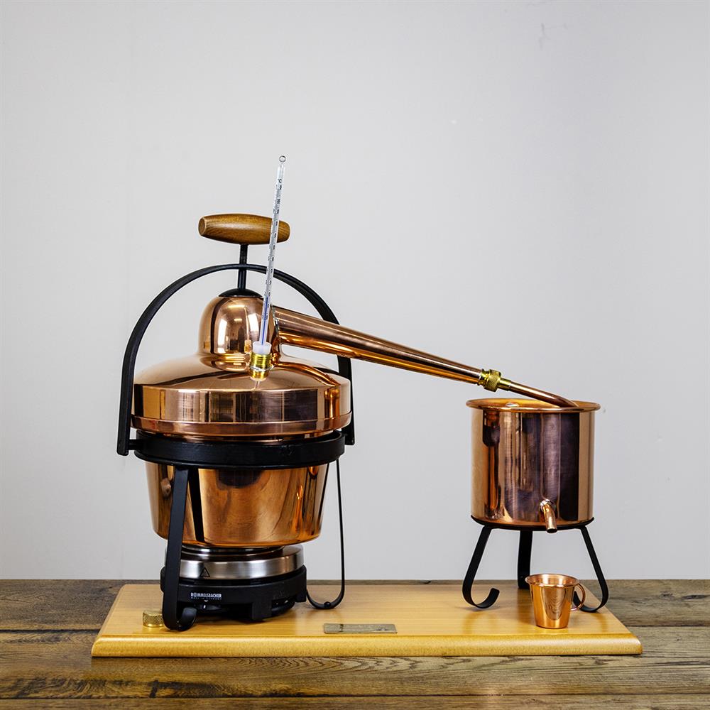 Til denne model medfølger der en el-kokeplate og en lille kop til destillat, og den er forsynt med et termometer for konstant overvåkning av temperaturen. Der medfølger 1,5 meter slange til kølevand.