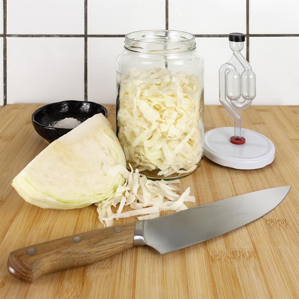 Dekorativt glas i en praktisk størrelse til fermentøren som fermenterer mange forskellige slags grønsager og kombinationer.
