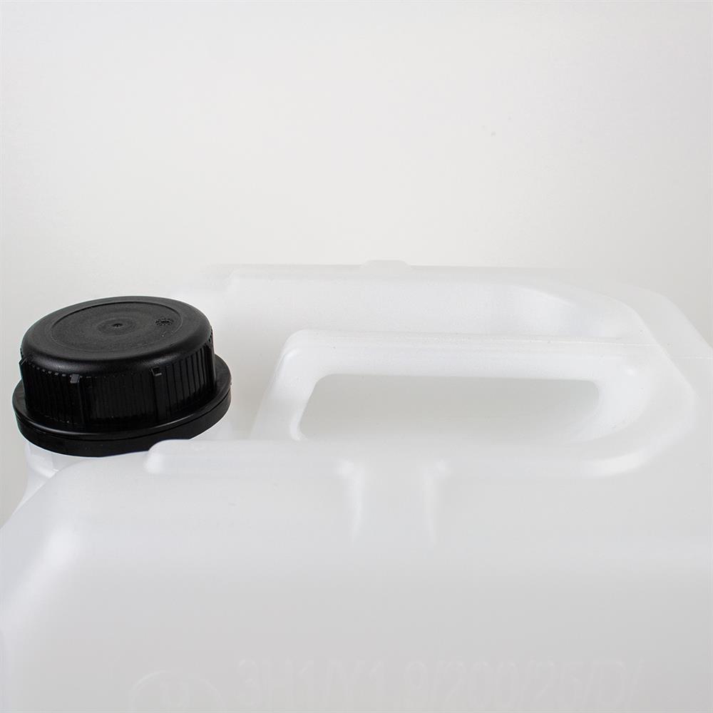 Dunken är utformad med plan topp och botten, vilket gör den enkel att stapla vid transport eller förvaring. Den svarta korken sluter tätt, och den breda öppningen gör det lätt att fylla, tömma och rengöra dunken.