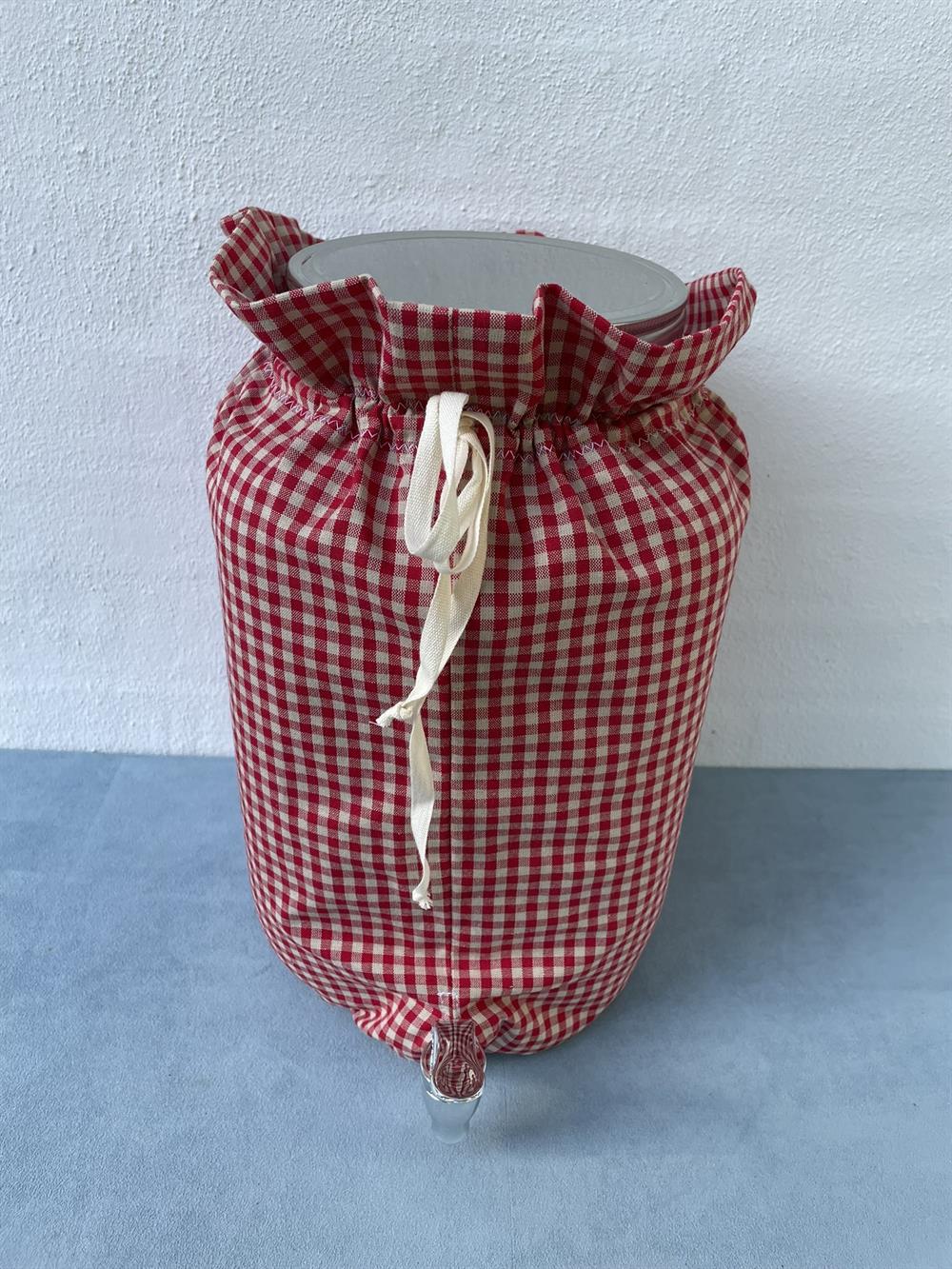 Vinäger kruka av glas med tappekran, rødternet stof, 8 liter